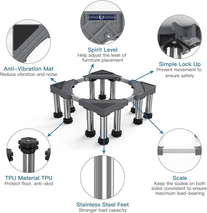 - 【 Stoß- und Geräuschreduzierung 】 Unser Untergestell für Waschmaschine und Trockner hält nicht nur die Unterseite der Maschine belüftet und trocken, wodurch die Lebensdauer der Maschine verlängert wird, sondern verfügt auch über rutschfeste Geräuschreduzierungspads an der Unterseite, die die Vibrationen und Geräusche der Waschmaschine oder anderer Geräte effektiv reduzieren.
