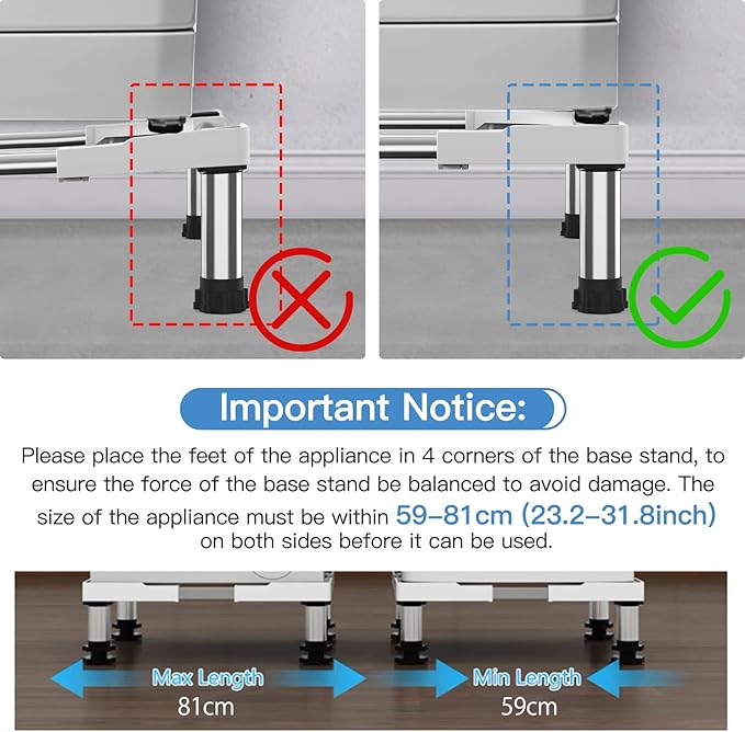- 【 Großer verstellbarer Kühlschrankständer 】Die Höhe dieses Waschmaschinenständers kann zwischen 18 und 21 cm (7–8,2 Zoll) bzw. 18–22 cm (7–8,6 Zoll) eingestellt werden, und die Breite kann zwischen 59 und 81 cm (23,2–31,8 Zoll) bzw. 43–57 cm (16,9–22,4 Zoll) eingestellt werden. Überprüfen Sie vor dem Kauf unbedingt die Größe des Möbelstücks und stellen Sie sicher, dass die Länge des Rohrs, das an beiden Enden in die Platte eintritt, während der Installation gleich ist, um die Stabilität des Basisständers zu gewährleisten.
