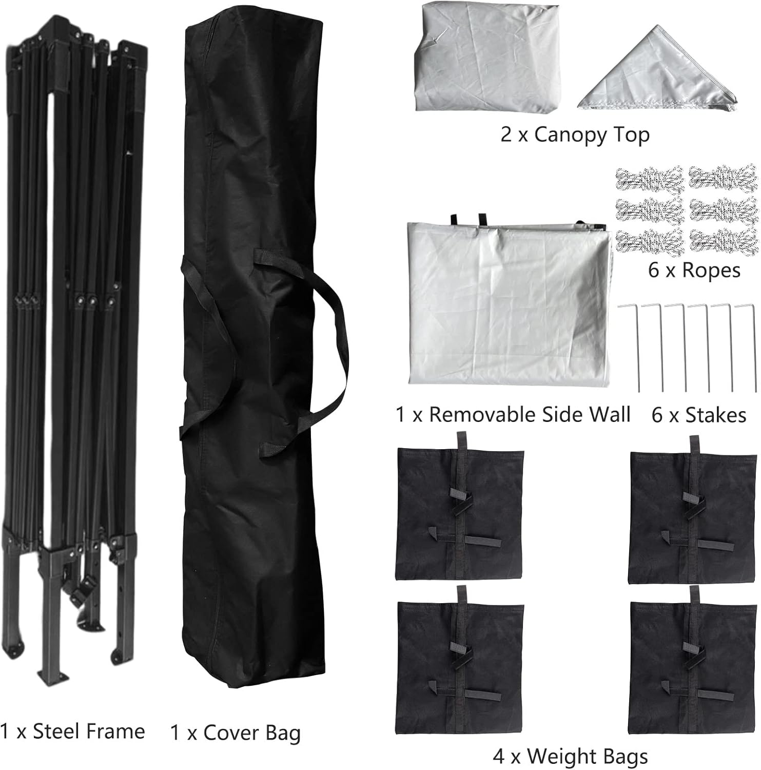 - 【セット内容】:10×10ポップアップキャノピーフレーム、トップカバー、取り外し可能なサイドウォール1枚、キャリーバッグ1個、土嚢4個、ロープ6本、杭6本。必要な付属品はすべて含まれています。