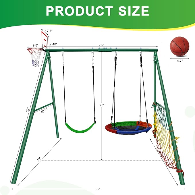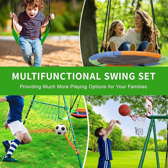 - [多機能ブランコセット] : ブランコセットには、ソーサーブランコシート1つとベルトブランコシート1つ、バスケットボールゴールバックボード付きバスケットボールフープ1つ、バスケットボール1つとニードル付きボールポンプ1つ、サッカーゴール1つが含まれており、さまざまな屋外アクティビティを組み合わせ、お子様に最適な裏庭プレイセットを提供します。