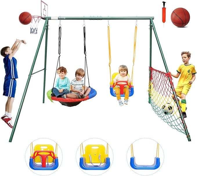 CYFIE 子供用屋外ブランコセット 金属フレーム、ソーサー&ベルトブランコ、バスケットボールフープ、サッカーゴール付き