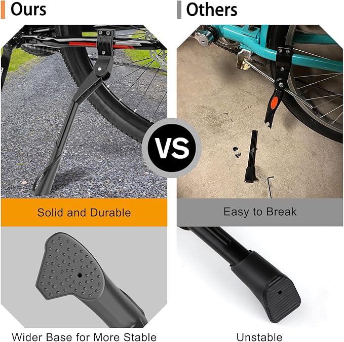 - 幅広の滑り止めフット- このキックスタンドは金属製のものよりもベースが広く、バイクをしっかりと支えるので、より安定した静止状態が確保され、濡れた表面での滑りや泥への沈み込みを防止します。
