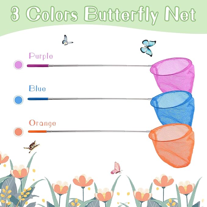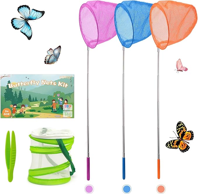 DEWEL 子供用 伸縮式 蝶・昆虫採集ネット 3個パック ポップアップメッシュケージとピンセット付き