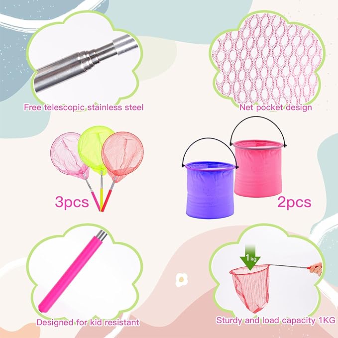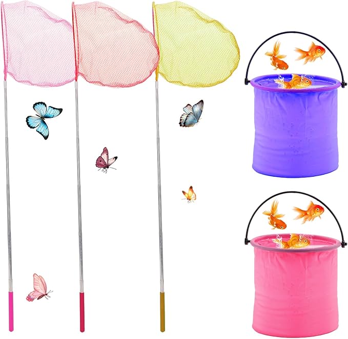 - 【パッケージ内容】子供用伸縮式バタフライネット3個と折りたたみ式バケツ2個をお届けします。鮮やかな色のバタフライネットは、あらゆる年齢のお子様が屋外で昆虫、小魚、カニなどを捕まえたり、探検したり、遊んだりするのに最適です。
