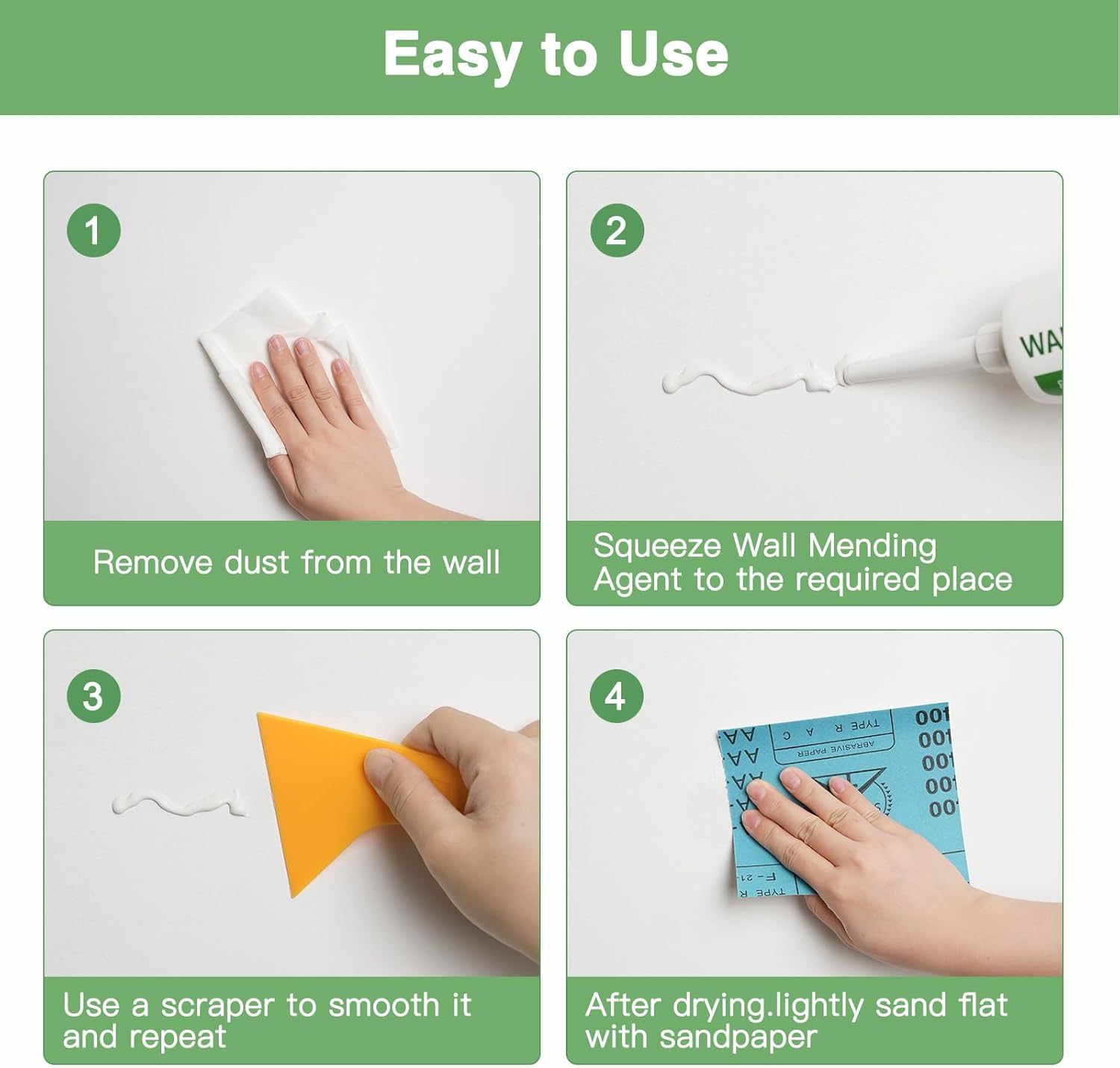 - 【使い方簡単】壁の損傷やひび割れを簡単な手順で素早く補修できます。押してこするだけで、穴やひび割れを素早く補修できます(この乾式壁パテを塗布する際は必ず手袋を着用してください)。スクレーパーを使用して、表面が滑らかになるまで壁補修ペーストを固定し、最後にサンドペーパーで磨き上げれば、補修跡はほとんど見えなくなります。また、開封後も収縮やひび割れがなく、再利用できます。