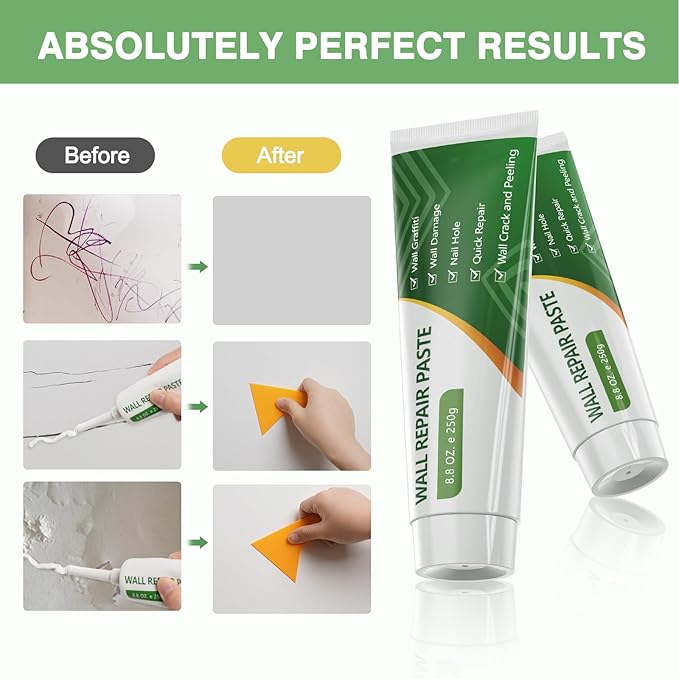 - 【幅広い用途】壁用補修材は、ひび割れ、釘穴、穴、欠け、傷、壁の剥がれ、落書き、汚れの補修に最適です。家庭、学校、オフィスの壁の損傷問題を簡単に解決できます。補修跡はほとんど目立たないため、損傷した壁、ひび割れ、汚れや落書きを隠すことができます。