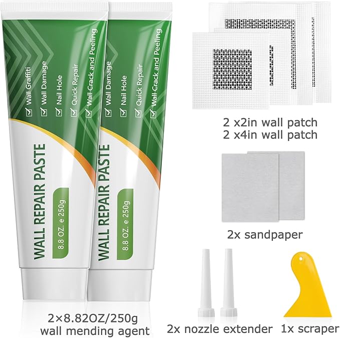 - 【完全な修理キット】乾式壁修理キットには、壁修理ペースト100g×2、スクレーパー×1、ノズルエクステンダー×2、4インチサンドペーパー×2、2インチ壁修理シート×2、4インチ壁修理シート×2が含まれています。(製品の最適な保管温度は-2℃~45℃です。温度が低すぎたり高すぎたりすると、使用に影響します。)