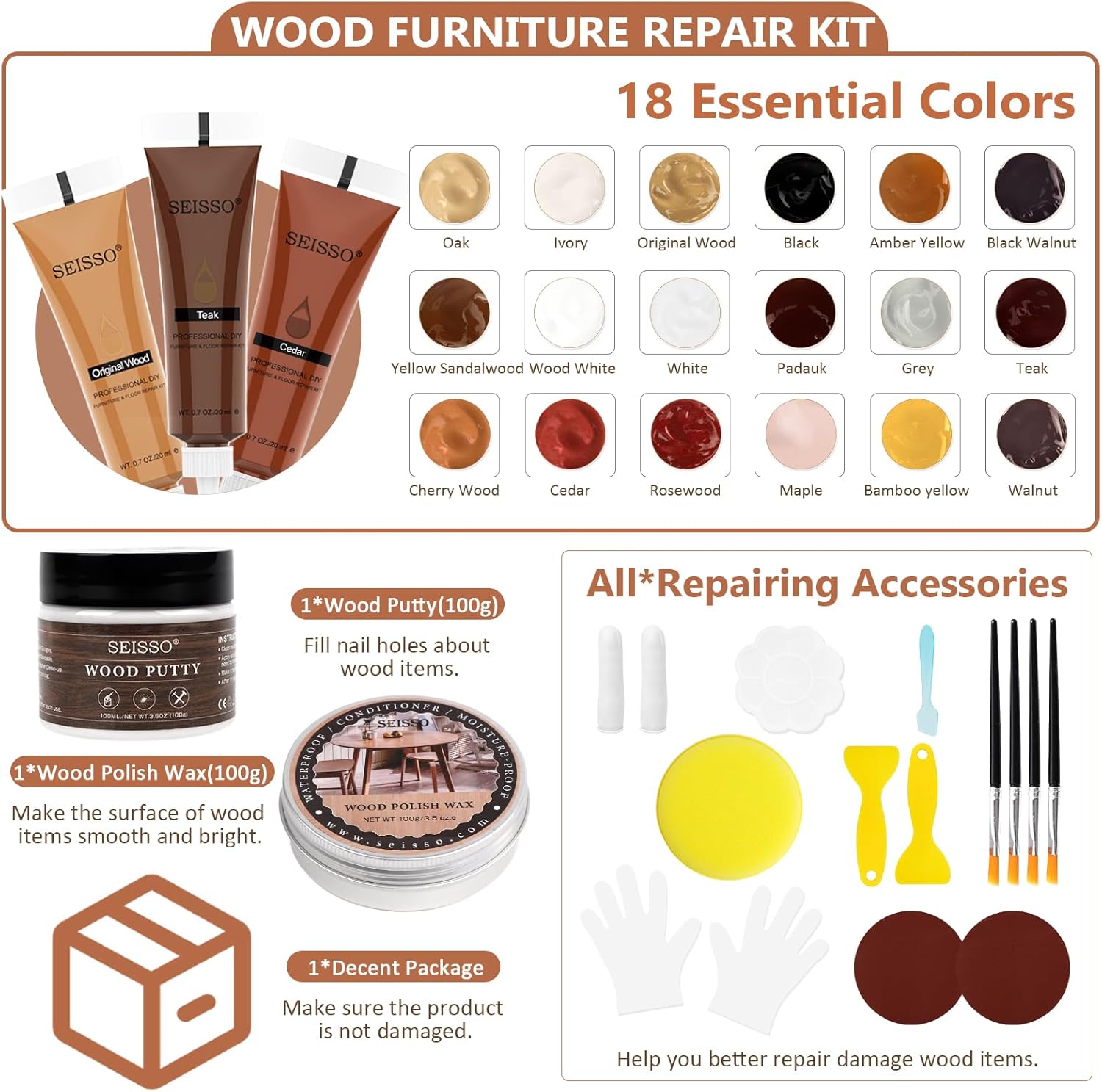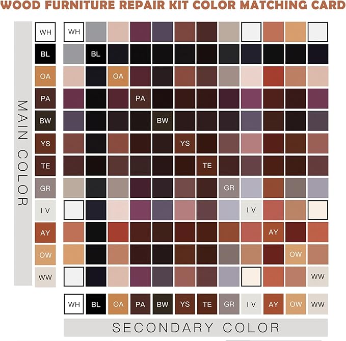 - 木製家具修理キットの色には、白、アイボリー、アンバーイエロー、ウッドホワイト、グレー、黒、オーク、チェリーウッド、イエローサンダルウッド、シダー、クルミ、ローズウッド、ログ、バンブーイエロー、チーク、ブラッククルミ、オリジナルウッド、パドックの 18 色があります。