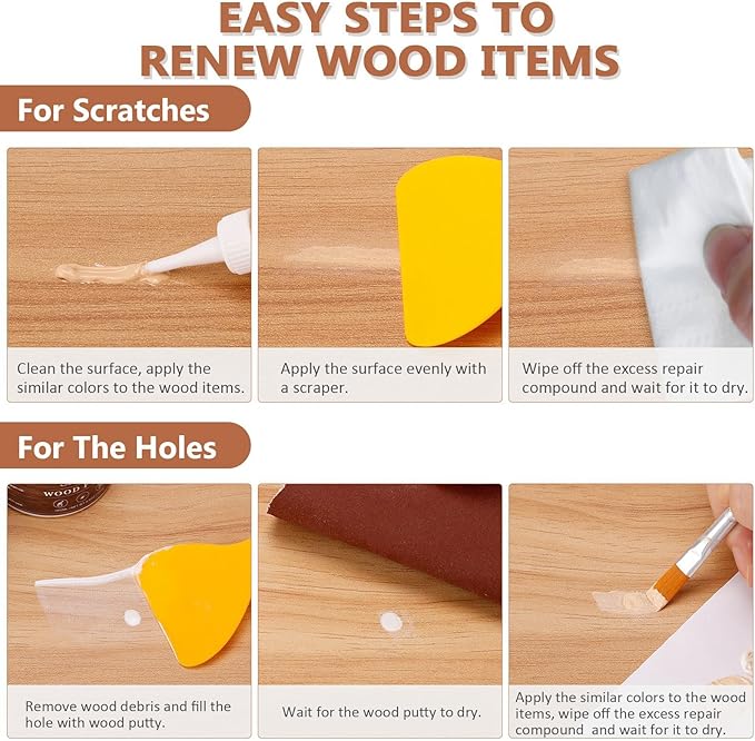 - 【多用途】木材充填パテキットは、木製の床、ドア、テーブル、椅子、ベッド、ワードローブ、本棚、キャビネットなどの家具を含むさまざまな表面のひび割れ、穴、隙間、傷、欠け、変色の修復に最適です。