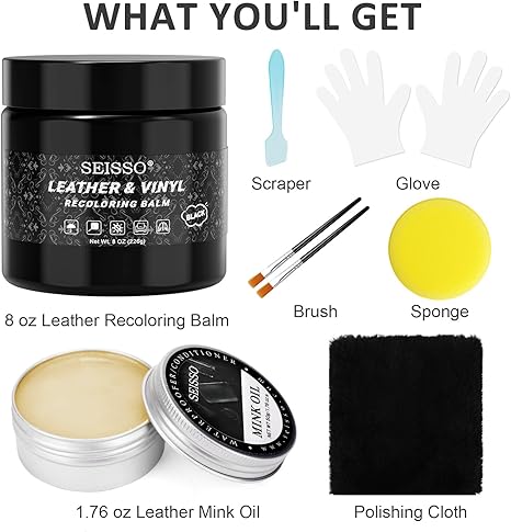 - 【プロフェッショナルな結果】このレザー修復キットは、レザーとビニールの修理キットを使用して素早く簡単に DIY 修理を行えるように完備されています。パッケージ内容: 8 オンスのレザー再着色バーム、1.76 オンスのミンクオイル、ブラシ 2 本、スクレーパー 1 本、スポンジ 1 個、手袋 1 組、磨き布 1 枚。