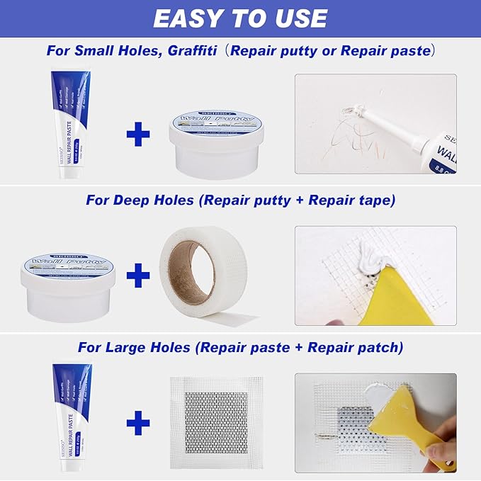 SEISSO ドライウォール補修キット – 2×250g ホワイトウォールパテ、補修テープ&パッチ付き