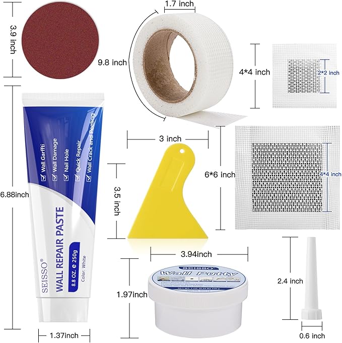 - 【内容物】ドライウォールパッチキットには様々な付属品が付いています。SEISSO壁補修キットには、壁パテ*1(250g)、乾式壁用プラスター*2(各250g)、乾式壁補修テープ*1、壁補修パッチ*4(2インチ*2、4インチ*2)、ノズルエクステンダー*2、スポンジサンドペーパー*2、スクレーパー*1、マニュアルが含まれています。
