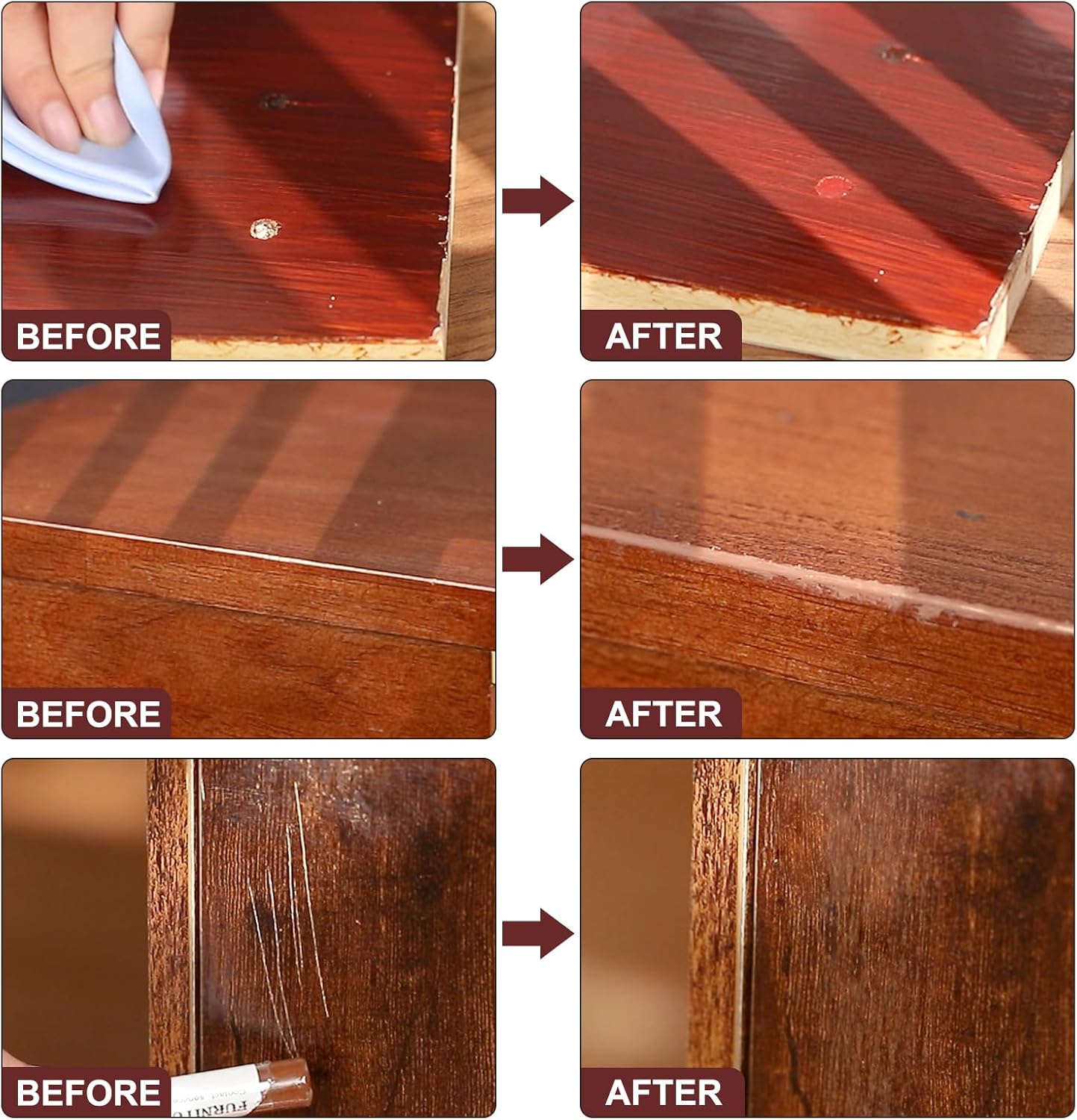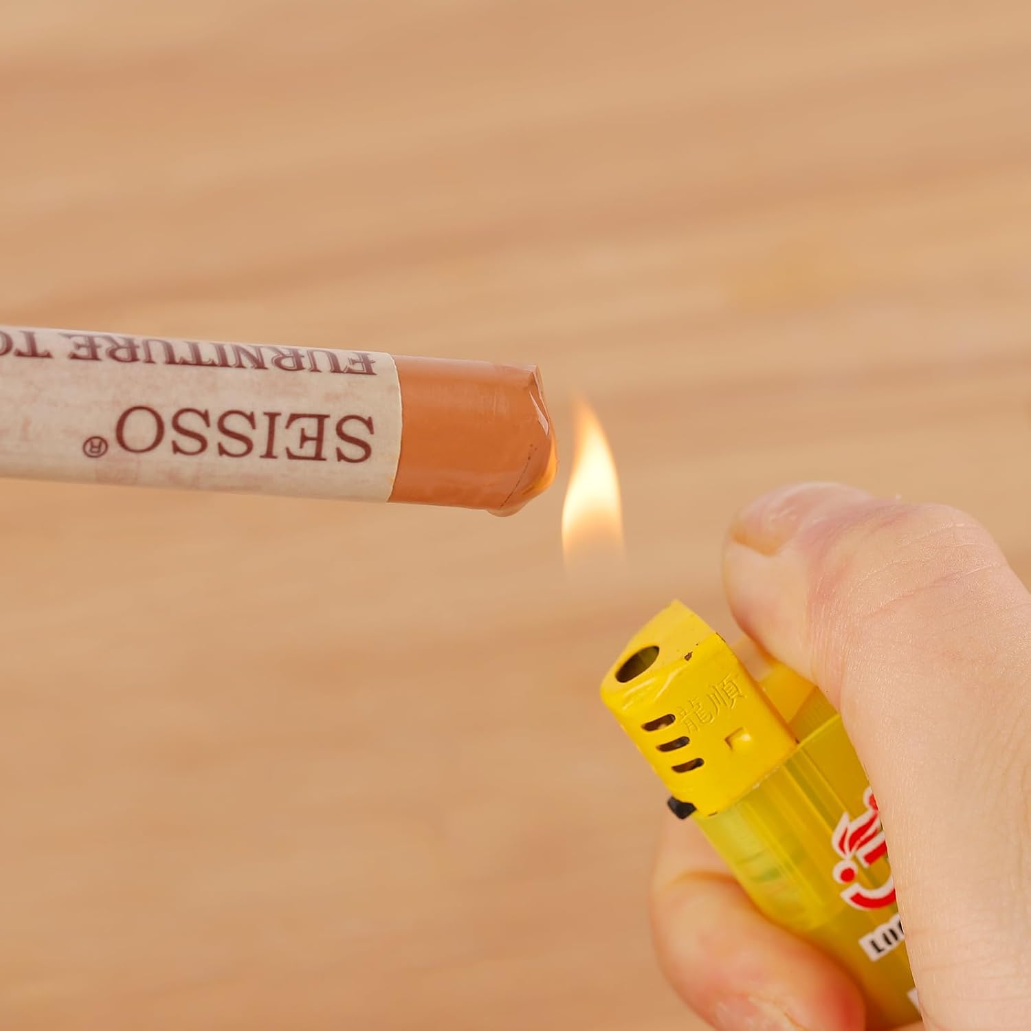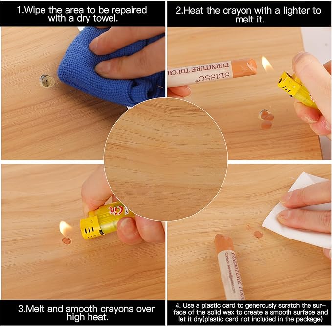 - 【使用方法】家具の色に合った木製クレヨンのセットをお選びください。まず、乾いたタオルまたは紙で補修する部分を拭きます。表面が軽微な損傷のある家具を補修する場合は、損傷部分を軽く拭くだけで十分です。損傷範囲が広い場合は、高温の機器を使用してワックスを加熱し、溶けたクレヨンを凹み全体に垂らします。その後、プラスチックカードで滑らかにし、ワックスが乾くまで待ちます。(プラスチックカードはパッケージに含まれていません)