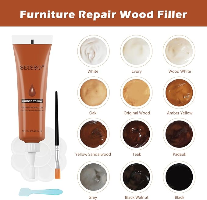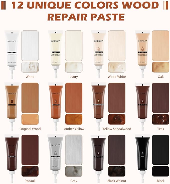 - 木製家具修理キット:SEISSO木製フィラーセットには、12色の樹脂修理フィラーペースト(各0.7オンス/ 20グラム)の多様なパレットが含まれており、カラーパレットを使用して、汚れや傷で傷ついた木製家具を素早く修理するのに役立ちます。