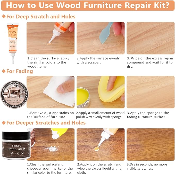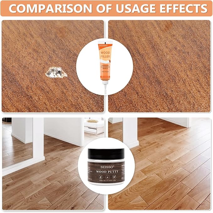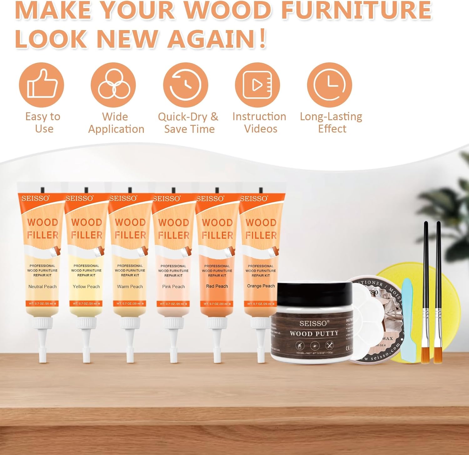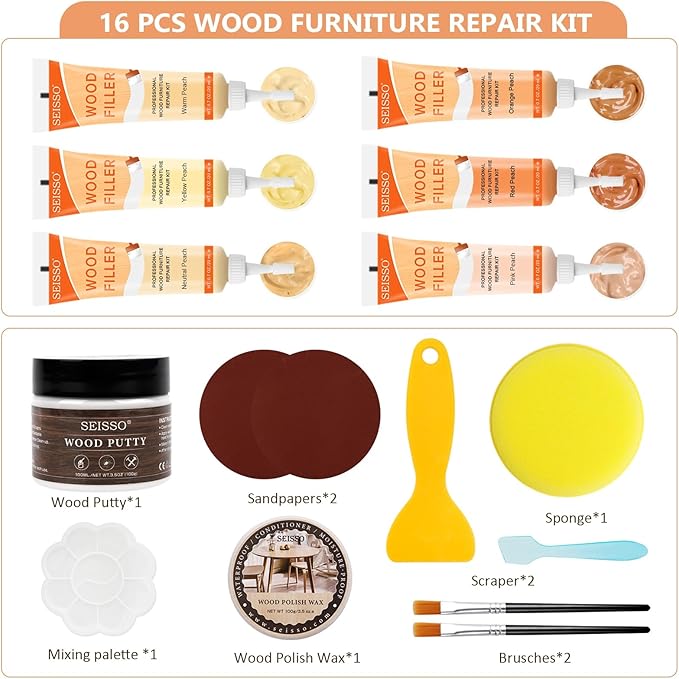 - 【木材補修キット】SEISSOの木製家具・床補修キットには、木材用充填剤6本、木材用パテ1本、木材用ワックス1本、ブラシ2本、サンドペーパー1本、スクレーパー1本、スポンジ1本、パレット1個が含まれています。この完全な木材補修キットがあれば、木製家具のあらゆるレベルの損傷を自分で簡単に補修できます。