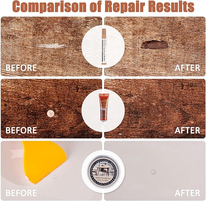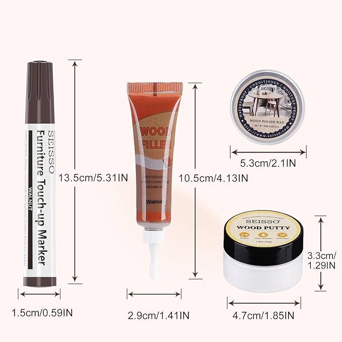 - 【木材修理キット】6色の木材フィラー、家具タッチアップマーカー6本、木材パテ1本、木材ワックス1本、黄色のスクレーパー1本、小さな青いスクレーパー1本、ブラシ2本、サンドペーパー1本、スポンジ1本、小さな瓶1本。SEISSO家具修理キットは、修理に必要なツールをすべて揃えており、木製家具のあらゆるレベルの損傷を自分で修理できます。専門家を雇う必要はありません。
