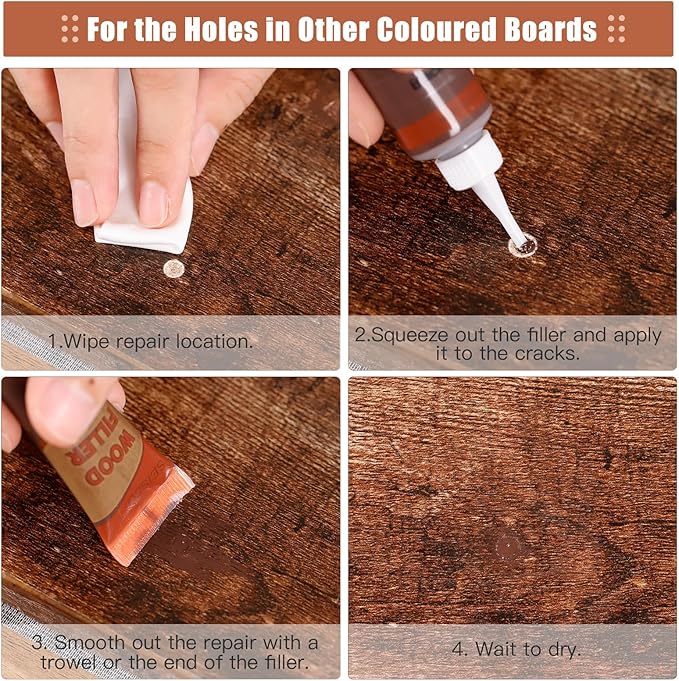 - 【使用方法】深くて大きな穴の場合は、表面を乾いたタオルまたは紙で拭き、木工パテを塗り、4時間乾燥させた後、サンドペーパーで滑らかにし、最後に木工補修ペーストまたはマーカーペンで着色してください。浅い傷や穴の場合は、補修が必要な部分をきれいにし、同系色の木工用充填剤を直接塗りつぶします。その後、余分な補修ペーストを拭き取り、滑らかにして乾燥させ、木工用ワックスで補修してください。