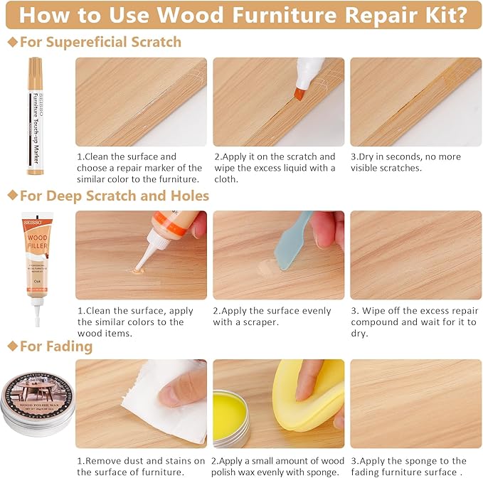 - 【使い方簡単】傷んだ部分にウッドフィラーを塗布し、余分な部分を削り取り、乾燥させてからウッドワックスで磨くだけで、新品同様の仕上がりになります。大きな穴やひび割れには、ウッドフィラーを追加してください。