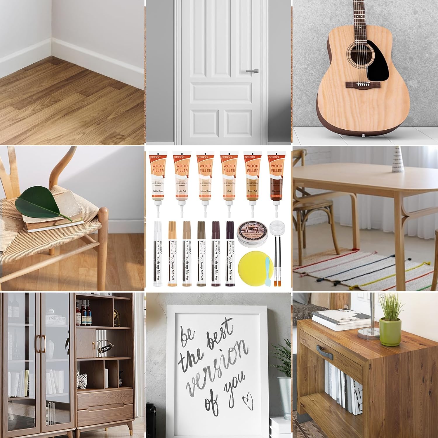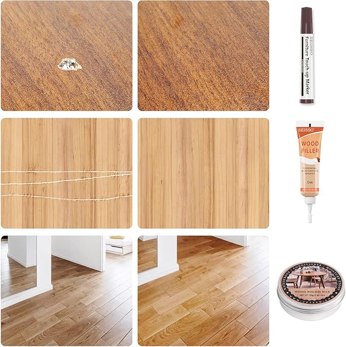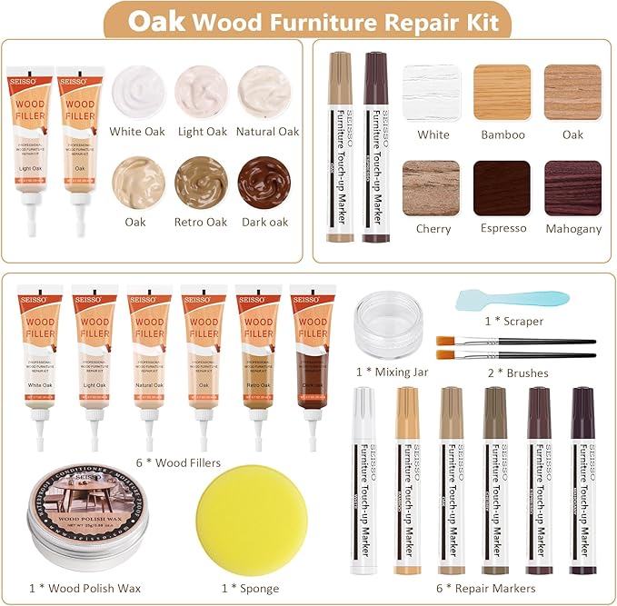 - 【アップグレードオーク材修理キット】当社の木製家具と床の修理キットには、木材充填剤6本、修理マーカー6本、木材磨きワックス1本、ブラシ2本、スクレーパー1本、スポンジ1個、ミキシングジャー1個が含まれており、あらゆるレベルの損傷を簡単に修復できます。