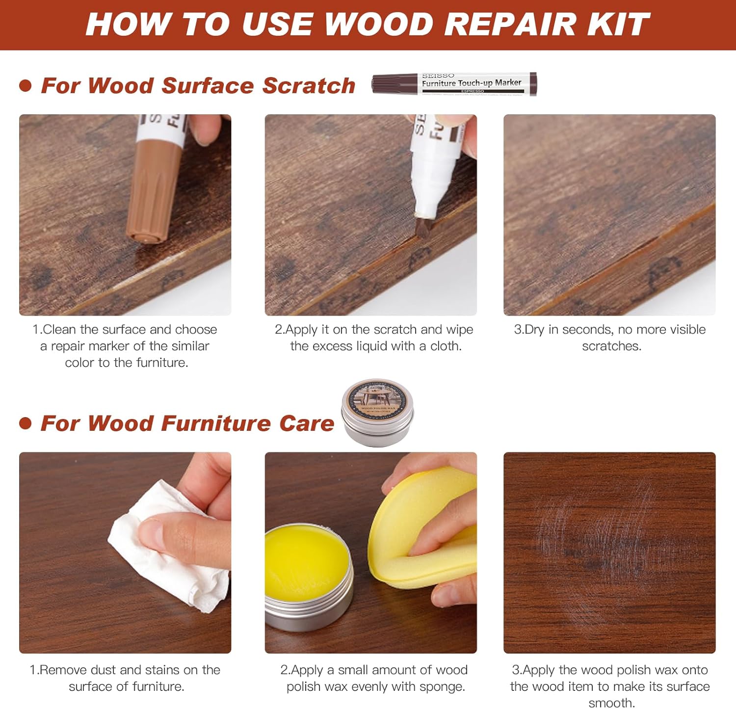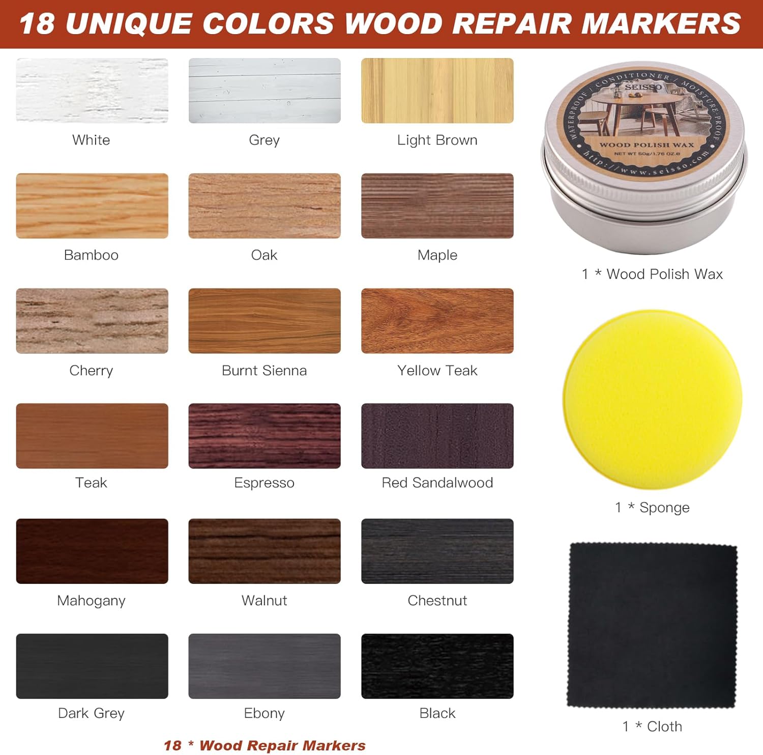 - 【 새롭게 업그레이드된 터치업 마커 키트 】 저희 원목 가구 수리 마커 키트에는 클래식 색상 18가지 원목 수리 마커, 50g 원목 광택 왁스, 스펀지 1개, 먼지 없는 천 1개가 포함되어 있습니다. 원목 바닥과 가구의 긁힘, 얼룩, 변색을 복원하여 가구와 바닥을 새것처럼 보이게 하는 데 이상적입니다!