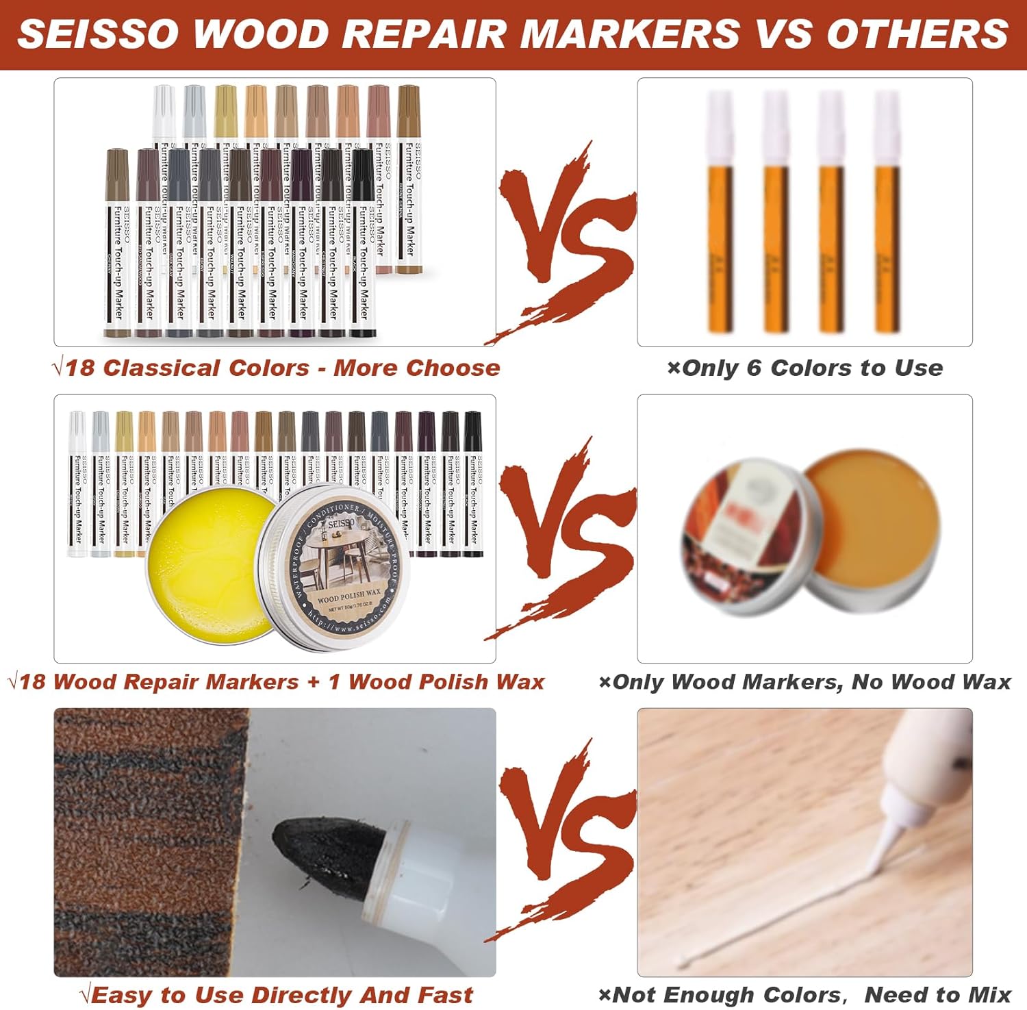 - 【 만족스러운 서비스 】 고품질 18가지 색상의 목재 수리 마커 키트를 사용하면 시간과 비용을 절약하고 가구를 새것처럼 꾸밀 수 있습니다! 목재 가구 및 바닥 수리 키트에 대해 궁금한 점이 있으시면 언제든지 문의해 주세요.