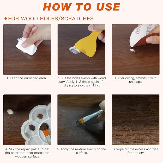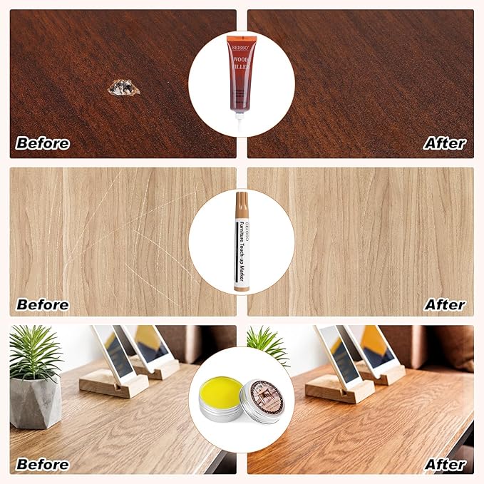 - 【 다양한 용도 】이 가구 복원 세트는 나무 바닥, 테이블, 침대 기둥, 서랍장, 보석함, 액자, 옷장, 악기의 바닥 긁힘, 얼룩, 균열, 구멍, 변색을 복구하는 데 적합합니다. 저희 전문 목재 긁힘 복구 세트는 가구와 바닥을 본래의 아름다움으로 복원해 드립니다.