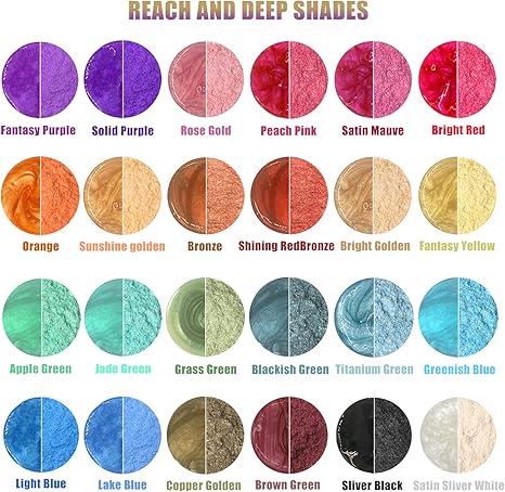 - 【Widely Dye Application】-- Our mica powder apply to many dye crafts like epoxy, slime , hand soaps, candles , nail polish , car freshies and makeup material such as eyeshadow, glitter lipgloss and so on. Then next turn to you to make your artwork pop!
